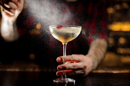 professional barista finishes preparation of pink alcoholic cocktail with mint leaves in crystal glass by adding a bitter of powdered sugar