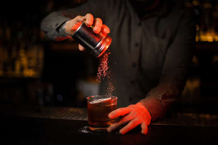 Tattooed professional bartender adding spices powder into a cocktail glass filled with a fresh strong alcoholic cocktail with slice of lemon