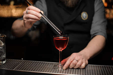 Bartender adding a bitter to the delicious cocktail from the special dasher bottle on the bar counter on the blurred background