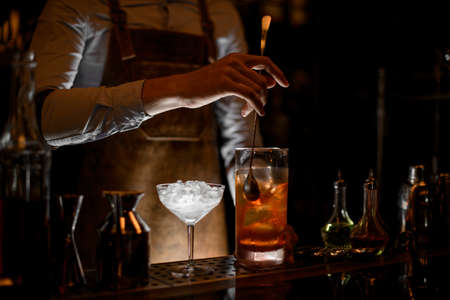 Barman stirring strong whiskey cocktail with ice cubes using a professional spoon on the bar counter