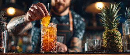 Concentrated mixed race male expert bartender decorates a cocktail with precision at the bar counter