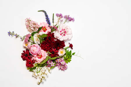 Background banner with colorful beautiful floral bouquet of garden flowers with copy space on a white background.