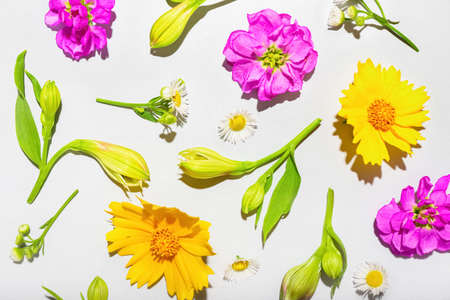 Pattern of colorful natural fresh flowers heads against bright yellow background. Top view.