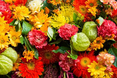 Decorated and embellished with beautiful vibrant artificial flower bouquets arrangements. Colorful artificial flowers as background or backdrop. Multicolored floral pattern wallpaper. Adorned flowers