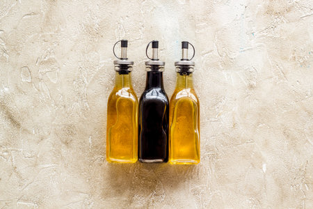 Organic fresh olive oil and soy sauce on the old grey wooden background. Free space for your text