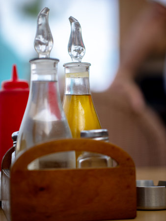 Old vintage glass bottles containing oil, vinegar, salt and pepper on a table in restaurant