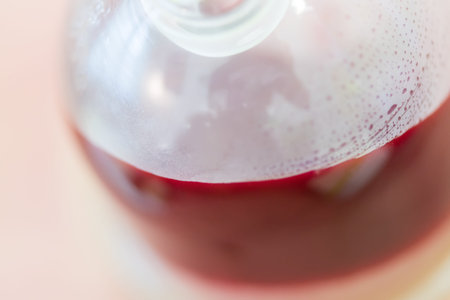 Red infusion in recycled glass bottle with horizontal shadow over celeste blue background. National Day concept. Copy space ready to add text.