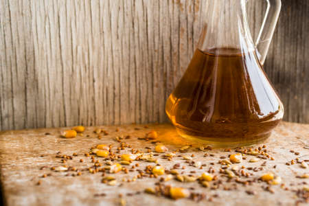 Close up various grains scattered on table and oil