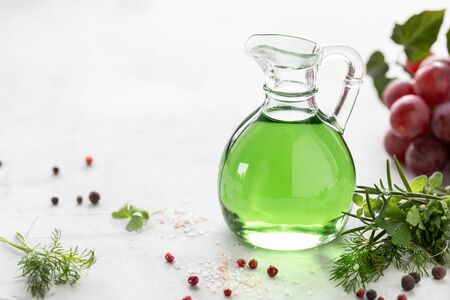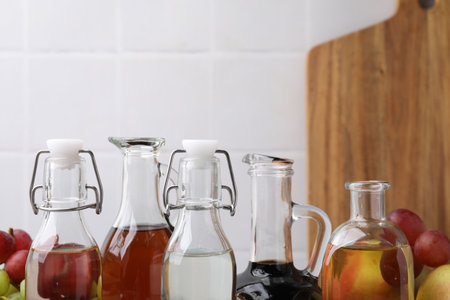 Original glass bottles with different vinegar on a marble table against a background of a white brick wall. Copy space.
