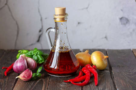 Olive oil with spices in a bottle on a wooden table, next to chili, garlic, onion, basil. Place for your text.