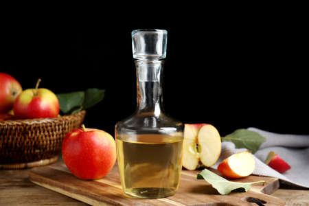 Homemade apple vinegar and ingredients on wooden table