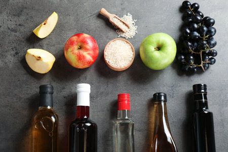 Flat lay composition with different kinds of vinegar and ingredients on gray background