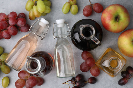 Different types of vinegar and fresh fruits on gray table, flat lay