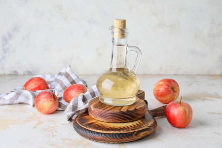 Healthy organic food. Apple cider vinegar in glass bottle and fresh red apples on a light background.