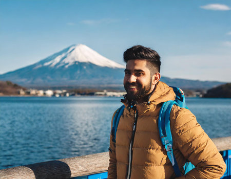 Handsome man with backpack and mountain Fuji at Kawaguchiko lake in Japan.