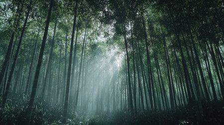 Sunlight pierces through the dense canopy of a bamboo forest, illuminating the mist that hangs in the air. The tranquil setting invites exploration and reflection.