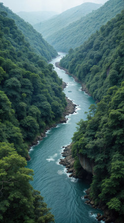 A vibrant turquoise river carves through a verdant canyon, reflecting the surrounding foliage. The image displays a natural landscape with textures of rock and dense vegetation, under daylight conditions. It may be suitable for environmental, travel, or editorial projects.