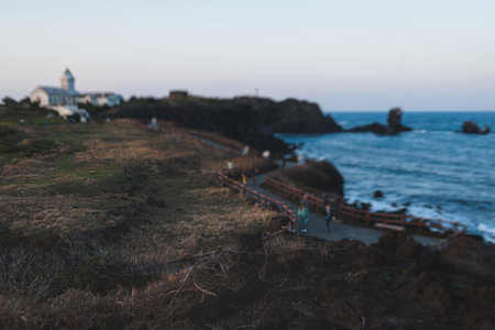 Jeju-do, Seopjikoji cape landscape with lighthouse and sea, east coast of Jeju Island, South Korea, Seongsan-ri, Seogwipo, Jeju Province view in a sunny day, with sea and cliffs