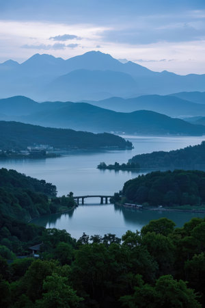 landscape of lake and mountains in the mist at dawn in summer
