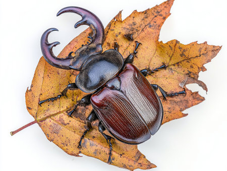 horned beetle showcases its robust, armored body and large impressive horns while resting on a colorful leaf, highlighting the beauty of nature.