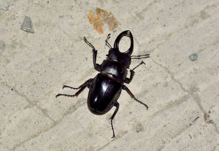 stag beetle with large antlers crawls on a stone of regular shape on a summer day