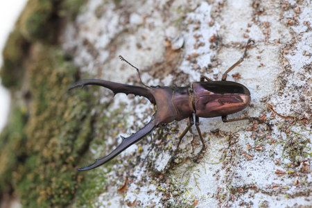 Male stag beetle with long and sharp jaws in wild forest sitting on the trunk of an oak tree, beetle stag consist of big horns, beautiful strong legs, stag beetle ready to attack for your life