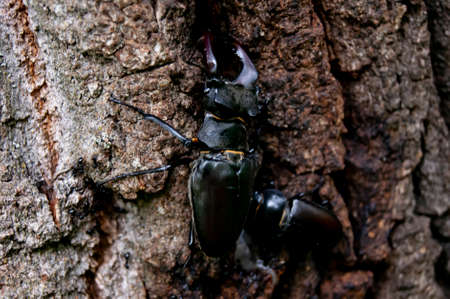 Male stag beetle with long and sharp jaws in wild forest sitting on the trunk of an oak tree. Beetle stag consists of big horns, beautiful strong legs. Stag beetle ready to attack for your life.