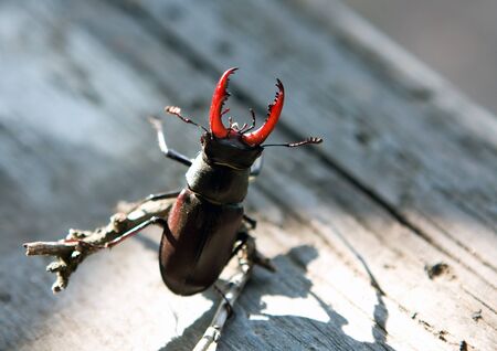 The stag beetle. A beetle in the red book. A very rare beetle. A beetle with horns in the wild.