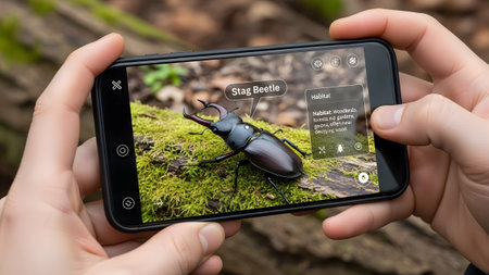 Hands hold smartphone identifying stag beetle with augmented reality overlay Clear details and vi...