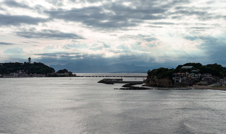 Enoshima Sea Candle and rugged shoreline in Kamakura after storm light