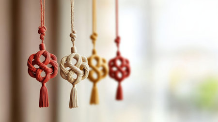 Intricate hanging decorative knots in soft focus, illustrating fine craftsmanship and attention to detail. these elegant creations highlight artistic traditions and cultural heritage.