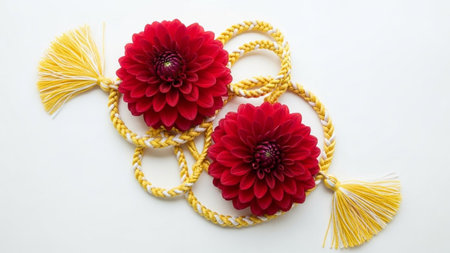 This image features an elegant arrangement of red fabric complemented by decorative tassels and flowers, ideal for festive themes and celebrations.