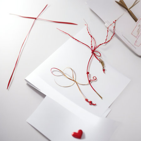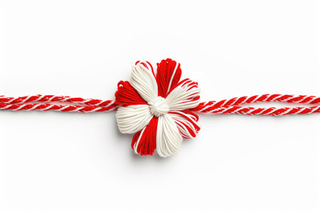 Martisor, red and white, yarn floss thread, holiday of welcoming spring in Moldova and Romania, celebrating on March , tradition give boutonnieres in the form of flowers Baba Marta