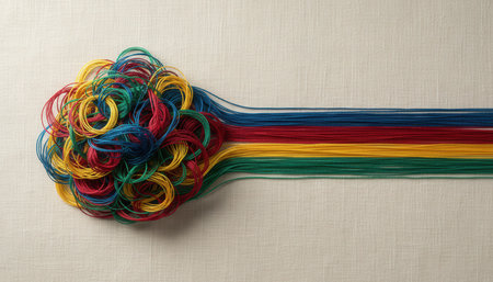 Vibrant threads in a spectrum of hues transform from a chaotic tangle into perfectly separated strands, representing the power of organization and problem-solving, perfect for conceptual displays.
