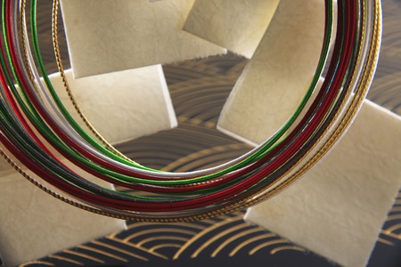Decorative Japanese cord made from twisted paper on the lacquered board.