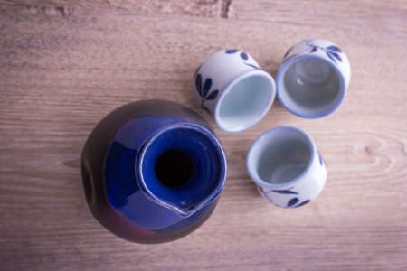 Japanese Sake drinking set on old wood texture background (focus on sake jug)