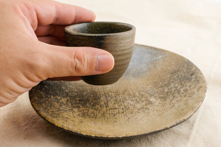 Preparation of the tea ceremony, tea in the bowl. Handmade cups.