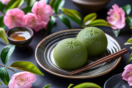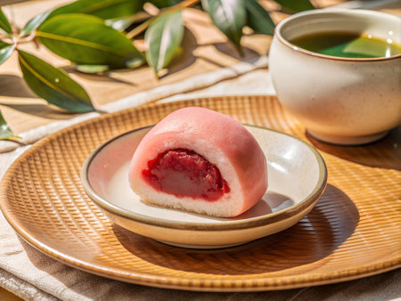 A daifuku mochi being enjoyed with a cup of green tea, showcasing a classic pairing in a serene setting.