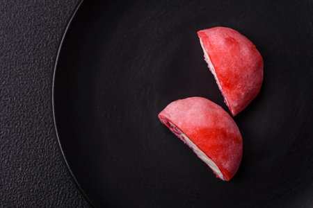 Delicious Japanese mochi dessert with colorful rice dough shell and fruit filling on dark concrete background