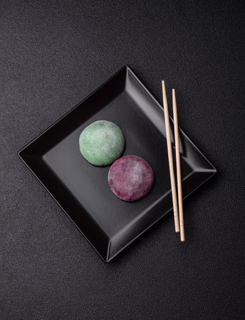 Delicious colorful asian mochi sweets with rice dough shell and fruit filling on dark concrete background