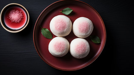 Generative AI, mochi on the dark table background, Traditional Japanese dessert, top view, flat lay