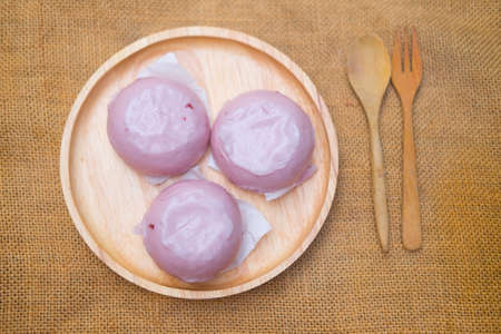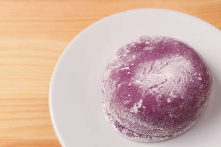 Closeup of Japanese Purple Sweet Potato Daifuku or Red Bean Paste Filling Rice Cake on White Plate