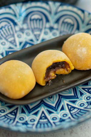 Yellow-colored Japanese Mochi in rice dough and on a pattern blue plate background. Traditional Japanese dessert.