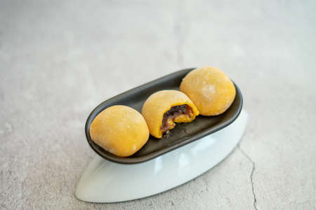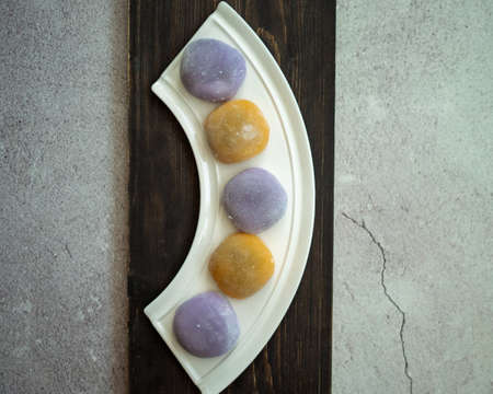 Yellow-colored Japanese Mochi in rice dough and on concrete background. Traditional Japanese dessert.