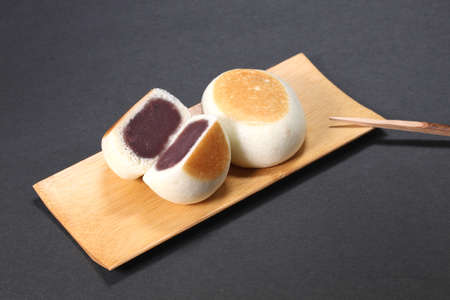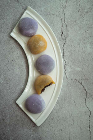 Japanese Mochi in rice dough and on a beautiful bamboo plate and concrete background. Traditional Japanese dessert.