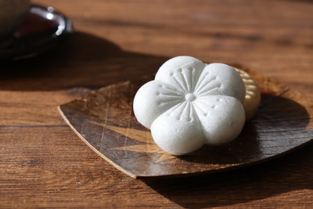 Delight in the beauty of traditional Japanese sweets served elegantly on a rustic wooden plate, accompanied by a calming tea cup, perfect for a serene snack experience.