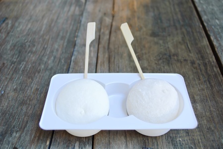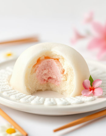 Soft steamed bun filled with cream and fruit presented on a decorative plate with flowers and chopsticks