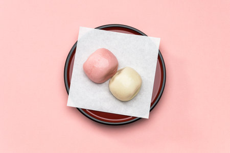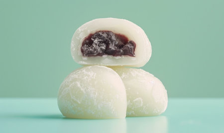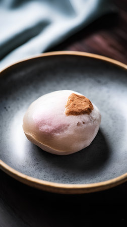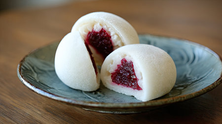 Experience the allure of traditional Japanese mochi, a soft rice cake filled with sweet red bean, presented beautifully on an ornate plate.