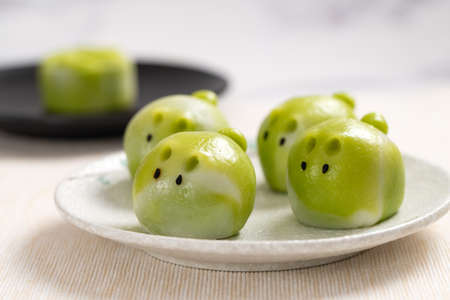 Traditional Chinese mid autumn festival dessert snowy skin rabbit shape mooncakes. The flavor is matcha green tea with pantan lotus paste