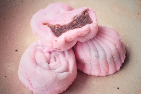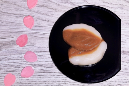 Cherry blossom rice cake is a Japanese sweet in spring. Close-up of Domyoji temple using Domyoji powder.